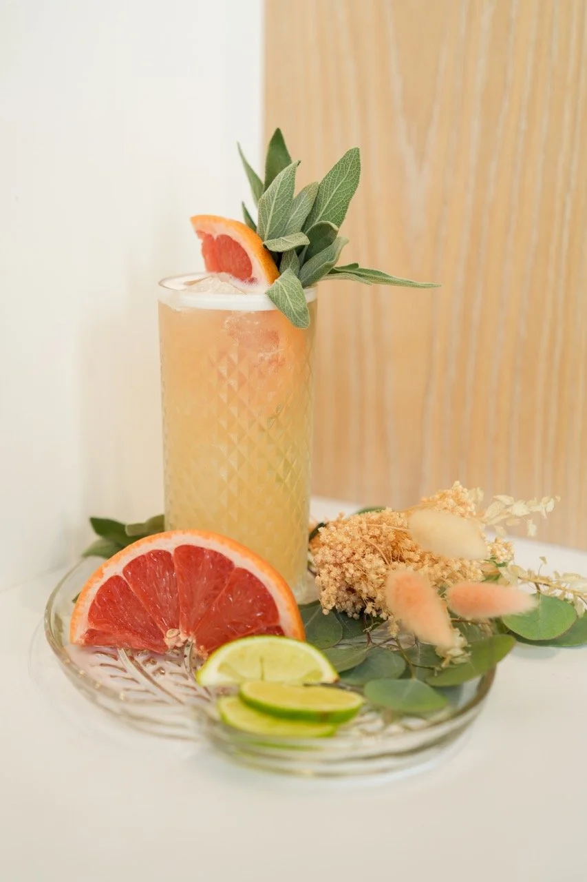 An herbal twist on the classic Paloma, featuring blanco tequila, grapefruit, St. Germain elderflower liqueur, and sage. Fresh and floral, it’s an elegant choice for any gathering.